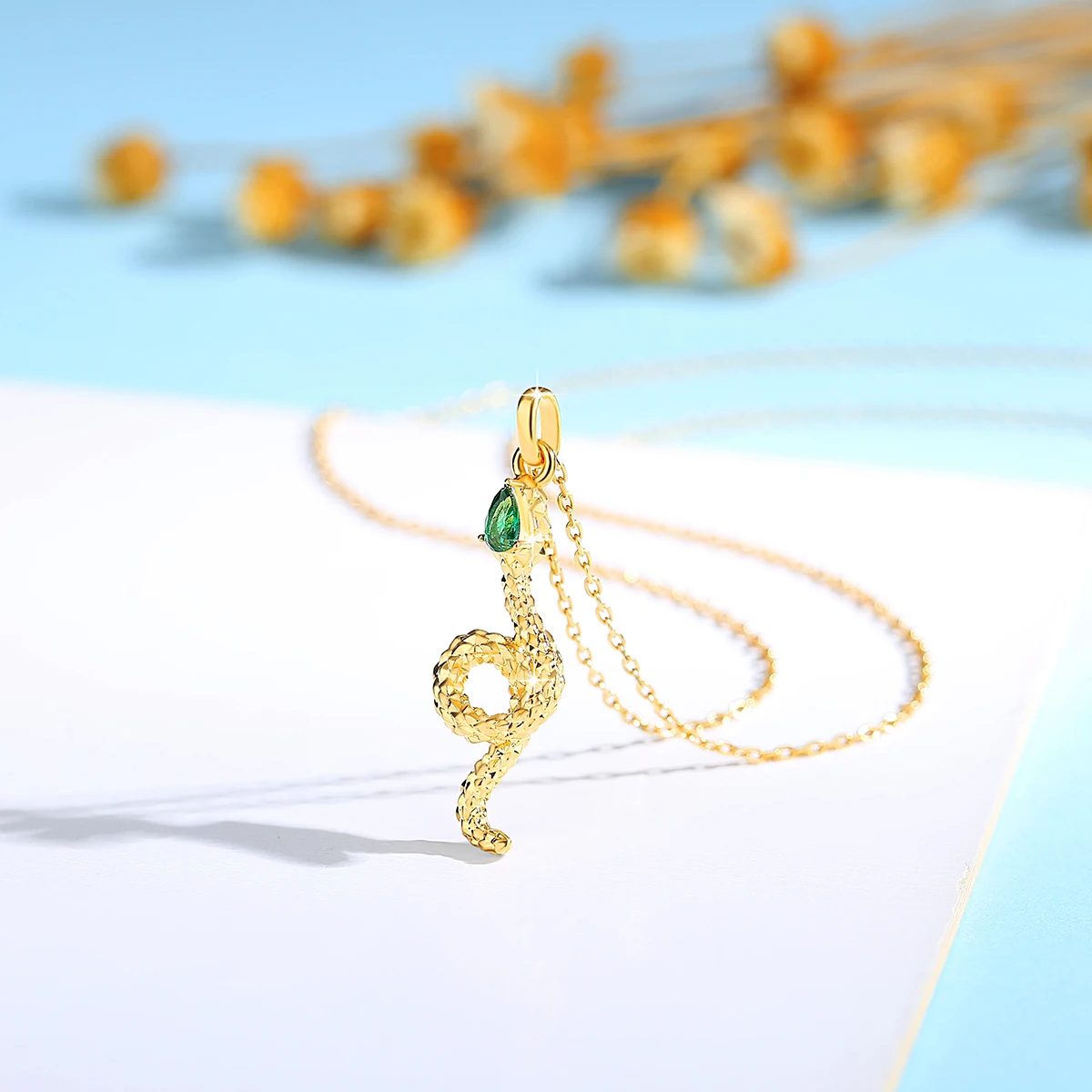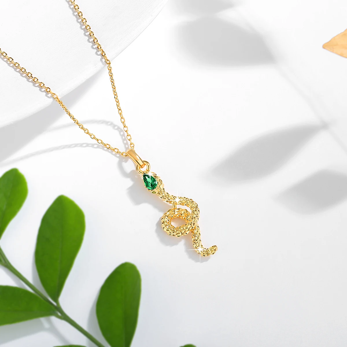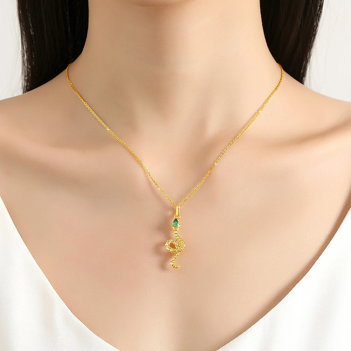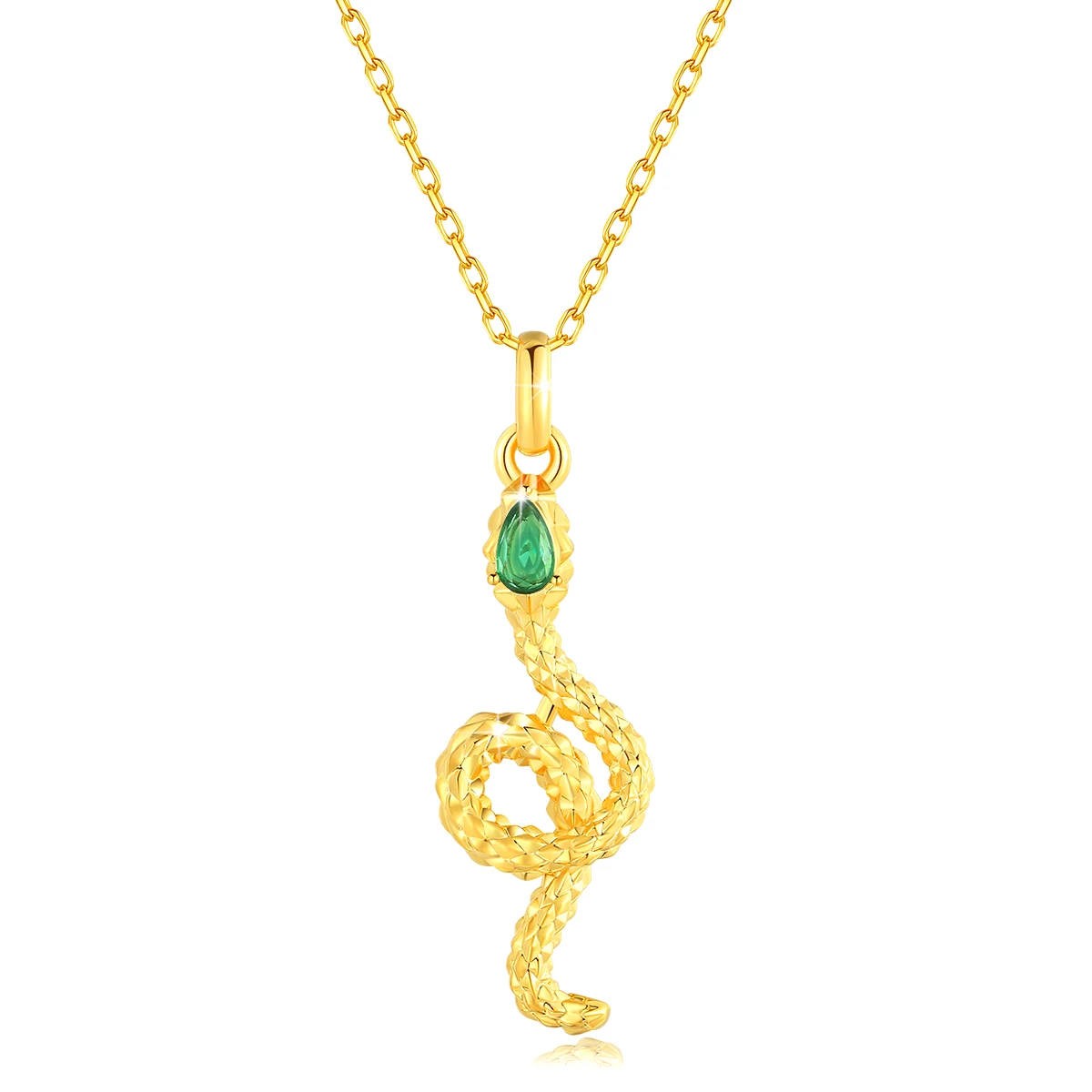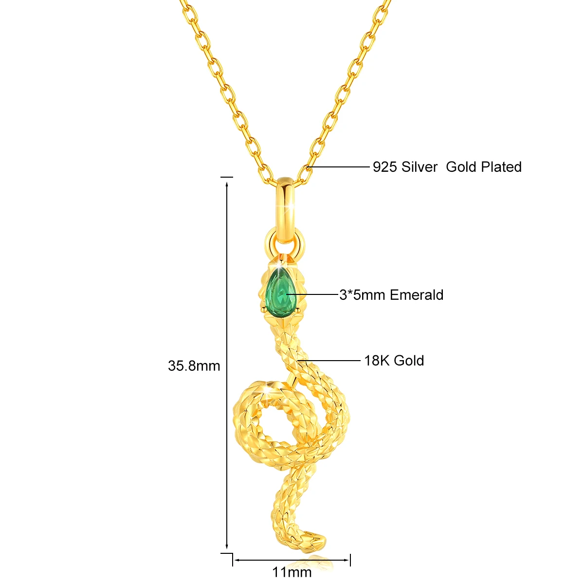 Exklusivt damhalsband med ormhänge i 100% äkta 18K guld (AU750) med naturlig smaragd. Hänget är tillverkat i äkta guld medan kedjan är i 925 sterling silver med guldplätering. Kedjelängd: 45cm. Kommer med certifikat och presentförpackning. Perfekt lyxig present för kvinnor.